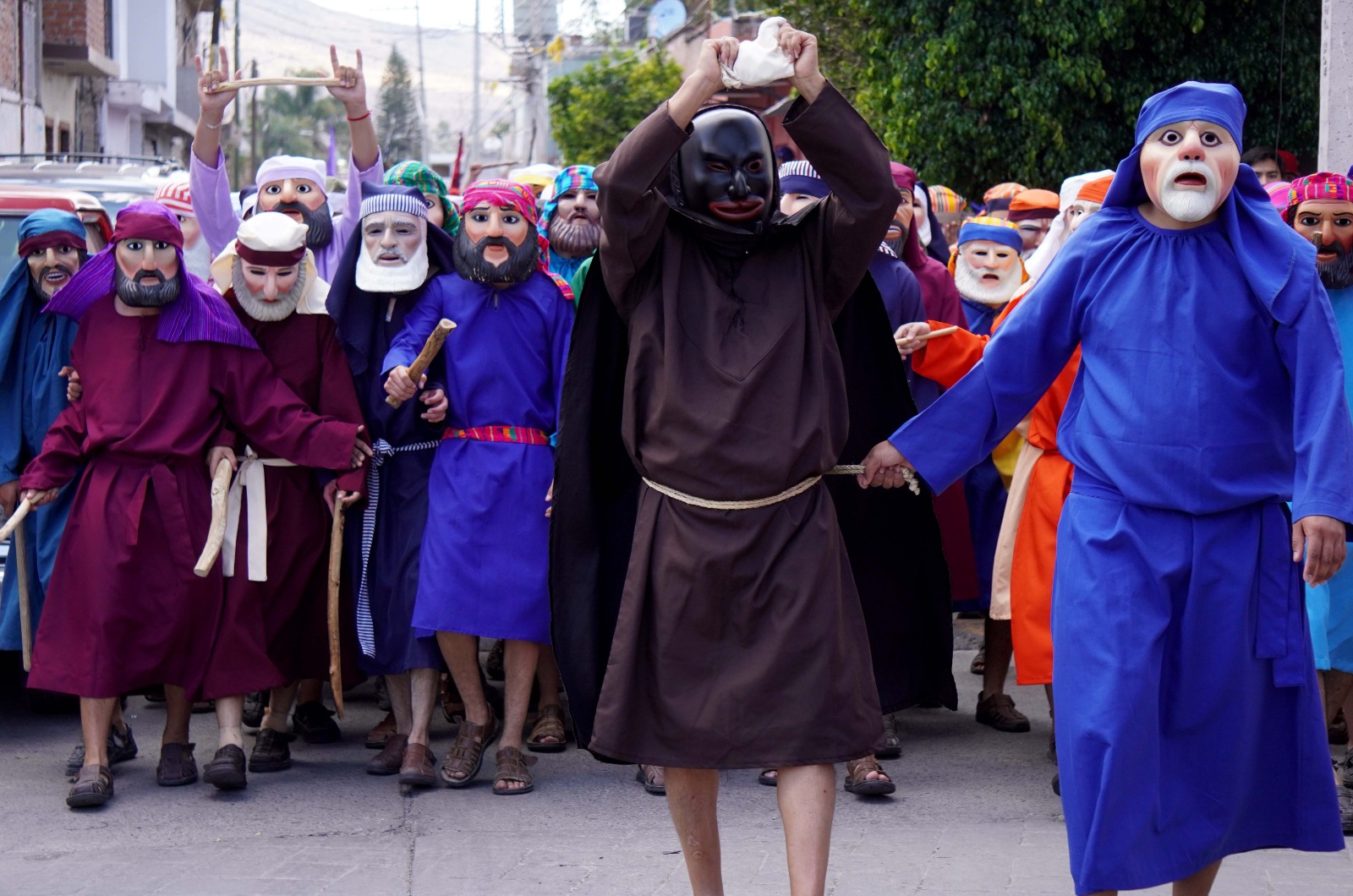 Participan los vecinos del pueblo persiguiendo al Judas vestidos de forma muy particular con atuendos de colores y máscaras de madera.