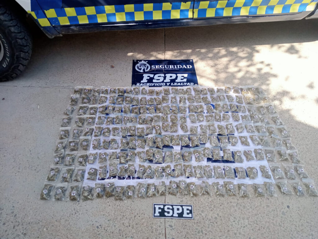 Los integrantes de la FSPE realizaron una inspección preventiva del área, localizando en la parte trasera de la camioneta una bolsa que contenía cuatro envoltorios tipo pelota, los cuales resguardaban en su interior 215 bolsas con hierba verde y seca con características de la marihuana, con un peso aproximado de 2.66 kilogramos, equivalente a 2 mil 660 dosis.