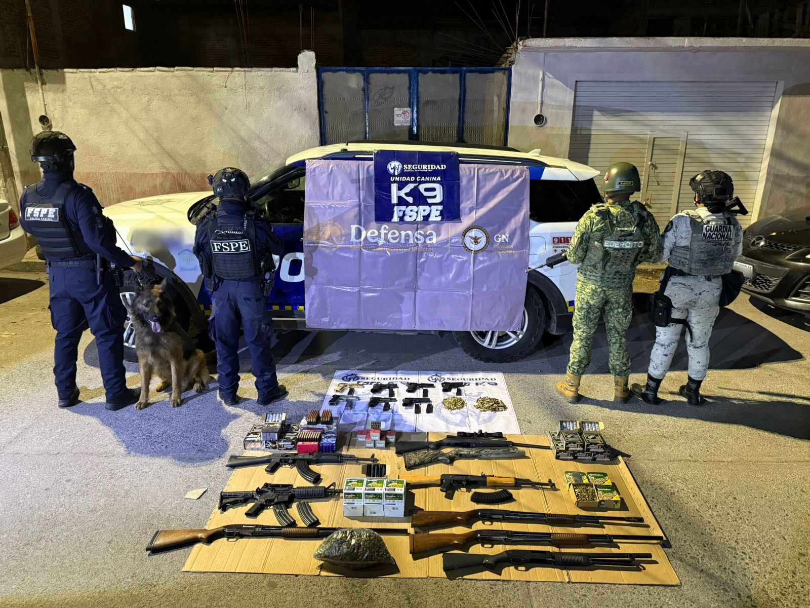 Luego de la inspección, se aseguraron ocho armas largas y siete armas cortas, una carcasa de rifle, doce cargadores, así como municiones de distintos calibres. También se localizó una bolsa con hierba verde y seca con características similares a la marihuana, con un estimado de 380 dosis.