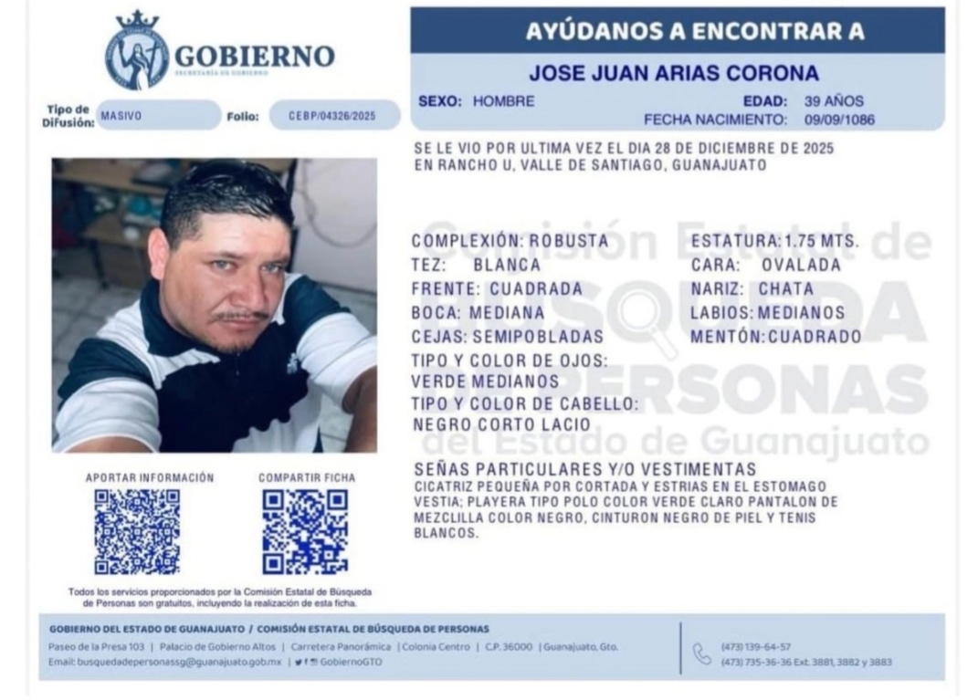 De acuerdo con los datos de la ficha de búsqueda de la Fiscalía de Guanajuato, José Juan , de 39 años de edad, fue visto por última vez el pasado domingo 28.