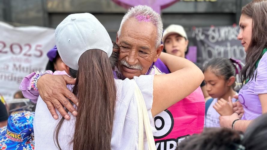 Durante la movilización, que recorre toda la Avenida Paseo de la Reforma hasta llegar al Zócalo, el padre viste con su icónica lona rosa y arroja puños de diamantina al aire en agradecimiento por el respaldo de las mujeres que, año tras año, adoptan su causa como propia.