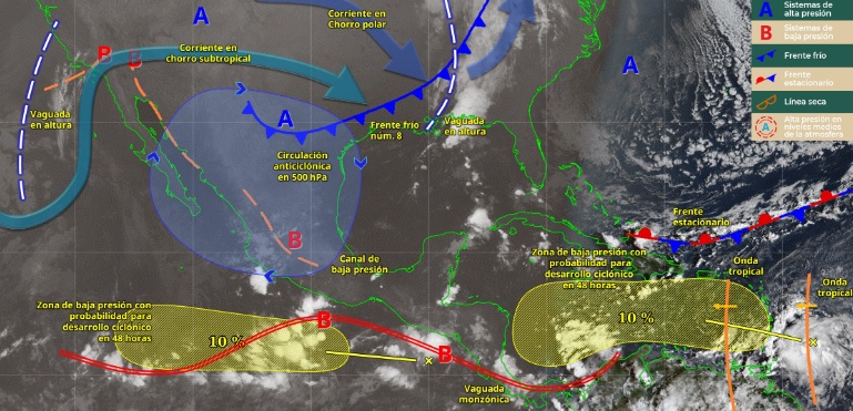 Finalmente, un canal de baja presión prevalecerá sobre el interior del territorio mexicano y aunado al ingreso de humedad del océano Pacífico y golfo de México, generarán lluvias y chubascos en el occidente y centro de la República Mexicana.