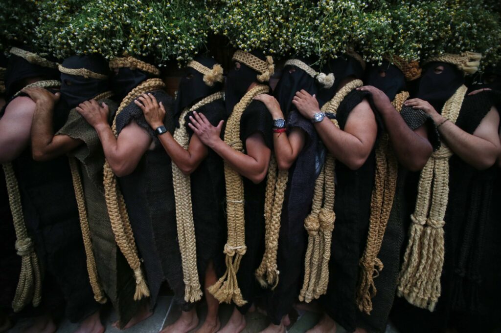 En esta representación participan diferentes congregaciones de penitentes que cargan pesados altares con imágenes alrededor de la iglesia mientras un sacerdote hace los rezos de las tres caídas.